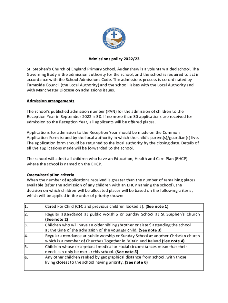 Admissions policy 2022/23 St. Stephens Church of England Primary School, Crenshaw is a voluntary aided school. The Governing Body is the admission authority for the school, and the school is required