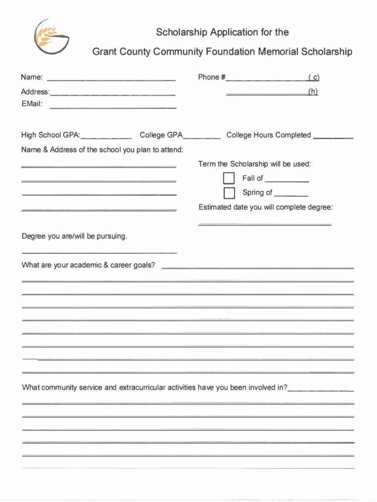 Grant County Community Foundation Memorial Scholarship In the Grant County Community Foundation guidelines for applying are as follows:Who:US Graduates or residents of Grant County:By obtaining and