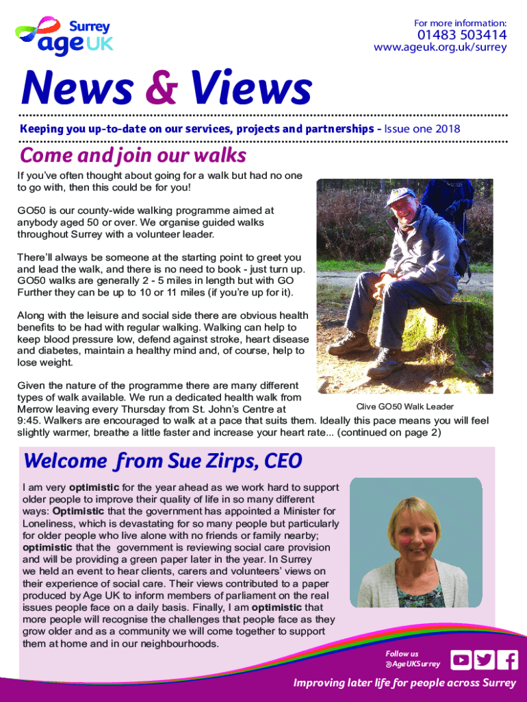 For more information:01483 503414www.ageuk.org.uk/surreyNews & Views Keeping you update on our services, projects and partnerships Issue one 2018Come and join our walks you've often thought about
