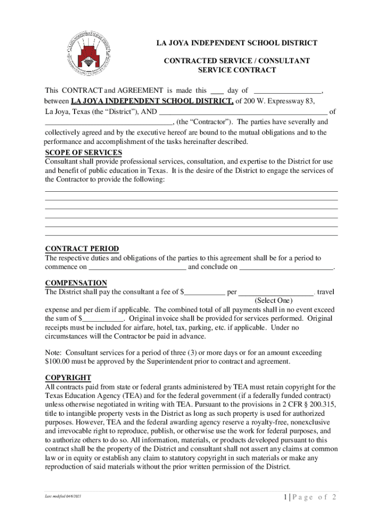 LA JOY INDEPENDENT SCHOOL DISTRICT CONTRACTED SERVICE / CONSULTANT SERVICE CONTRACT This CONTRACT and AGREEMENT is made this day of ___, between LA JOY INDEPENDENT SCHOOL DISTRICT, of 200 W. Expressway