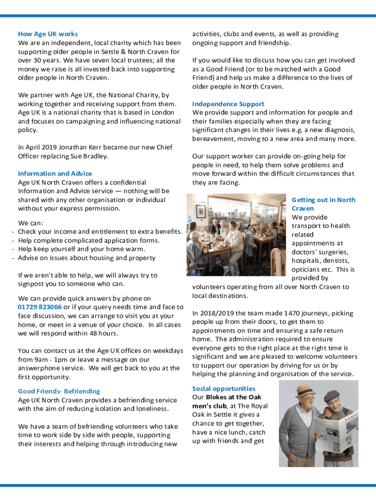 How Age UK works We are an independent, local charity which has been supporting older people in Settle & North Craven for over 30 years. We have seven local trustees; all the money we raise is all