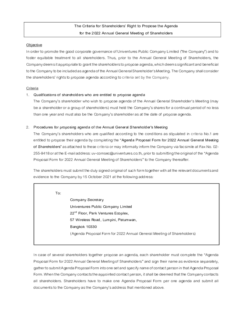 The Criteria for Shareholders Right to Propose the Agenda for the 2022 Annual General Meeting of Shareholders Objective In order to promote the good corporate governance of Univentures Public Company