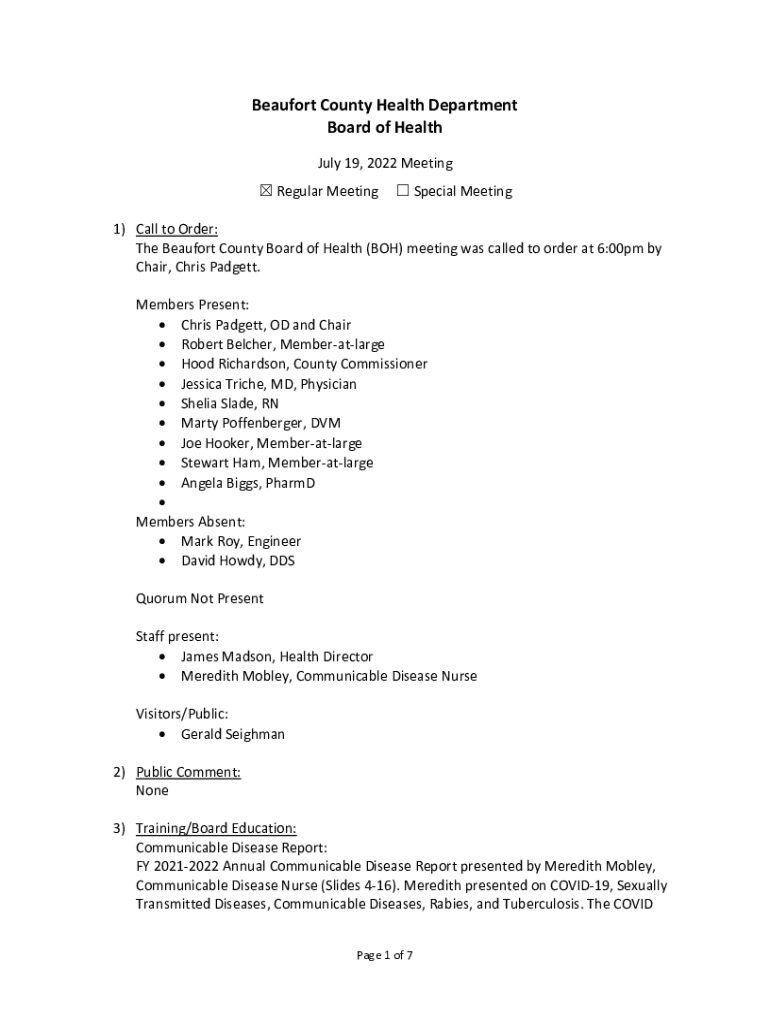 Beaufort County Health Department Board of Health July 19, 2022, Meeting Regular Meeting Special Meeting1) Call to Order: The Beaufort County Board of Health (BOH) meeting was called to order at 6:00pm