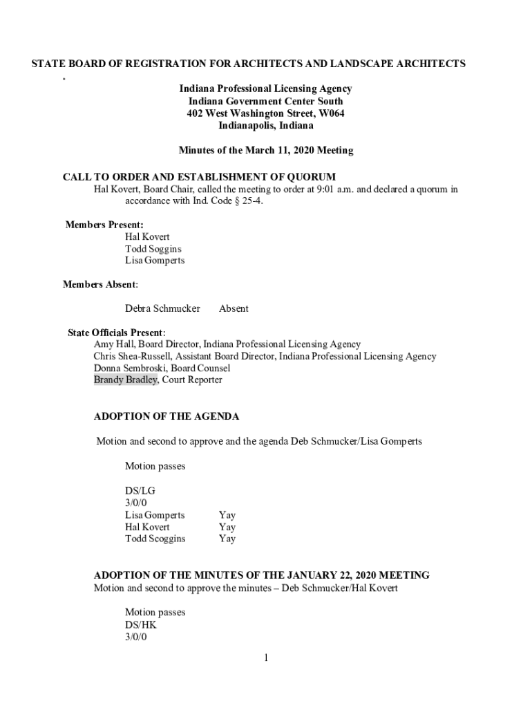 STATE BOARD OF REGISTRATION FOR ARCHITECTS AND LANDSCAPE ARCHITECTS. Indiana Professional Licensing Agency Indiana Government Center South 402 West Washington Street, W064 Indianapolis, Indiana Minutes