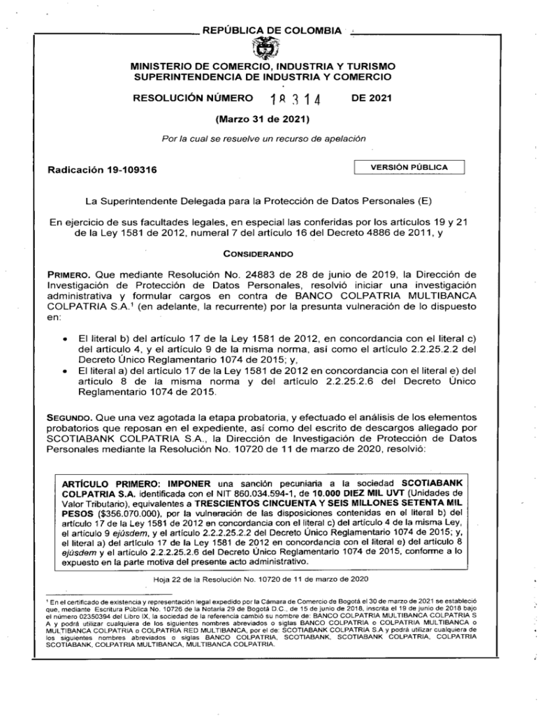 REPUBLICAN DE COLOMBIA *MINISTER DE COMER CIO, INDUSTRIAL Y TOURISM SUPERINTENDENCE DE INDUSTRIAL Y COMER CIO RESOLUTION NUMERO1^314DE 2021(Mario 31 DE 2021) POR la coal SE reserve UN recurs ode operation