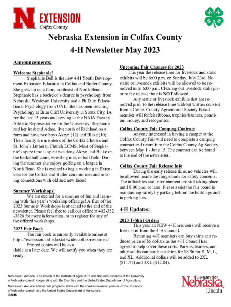 Nebraska Extension in Colfax County 4H Newsletter May 2023 Announcements: Welcome Stephanie! Stephanie Bell is the new 4H Youth Development Extension Educator in Colfax and Butler County. She grew