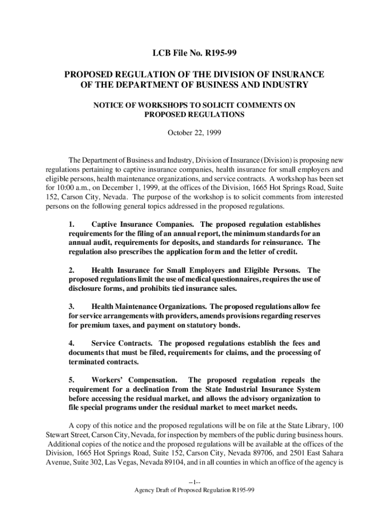 LAB File No. R19599 PROPOSED REGULATION OF THE DIVISION OF INSURANCE OF THE DEPARTMENT OF BUSINESS AND INDUSTRY NOTICE OF WORKSHOPS TO SOLICIT COMMENTS ON PROPOSED REGULATIONS October 22, 1999The