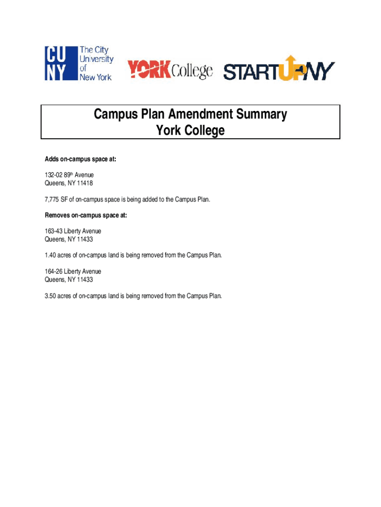 Atrocity University of NewYorkCampus Plan Amendment Summary York Colleges on campus space at: 13202 89th Avenue Queens, NY 11418 7,775 SF of on campus space is being added to the Campus Plan. Removes