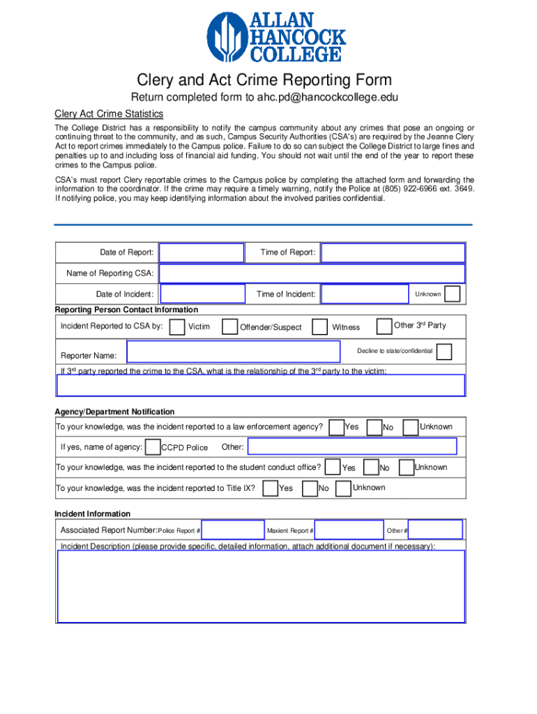 Clergy and Act Crime Reporting Form Return completed form to ahc.pd@hancockcollege.edu Clergy Act Crime Statistics The College District has a responsibility to notify the campus community about any