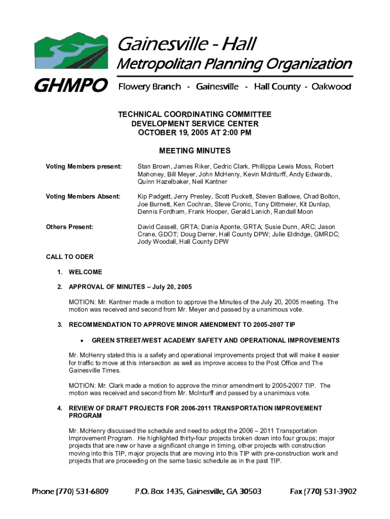 Gainesville Hall Metropolitan Planning OrganizationGHMPOFlowery Branch Gainesville Hall County Oak wood TECHNICAL COORDINATING COMMITTEE DEVELOPMENT SERVICE CENTER OCTOBER 19, 2005, AT 2:00 PM MEETING
