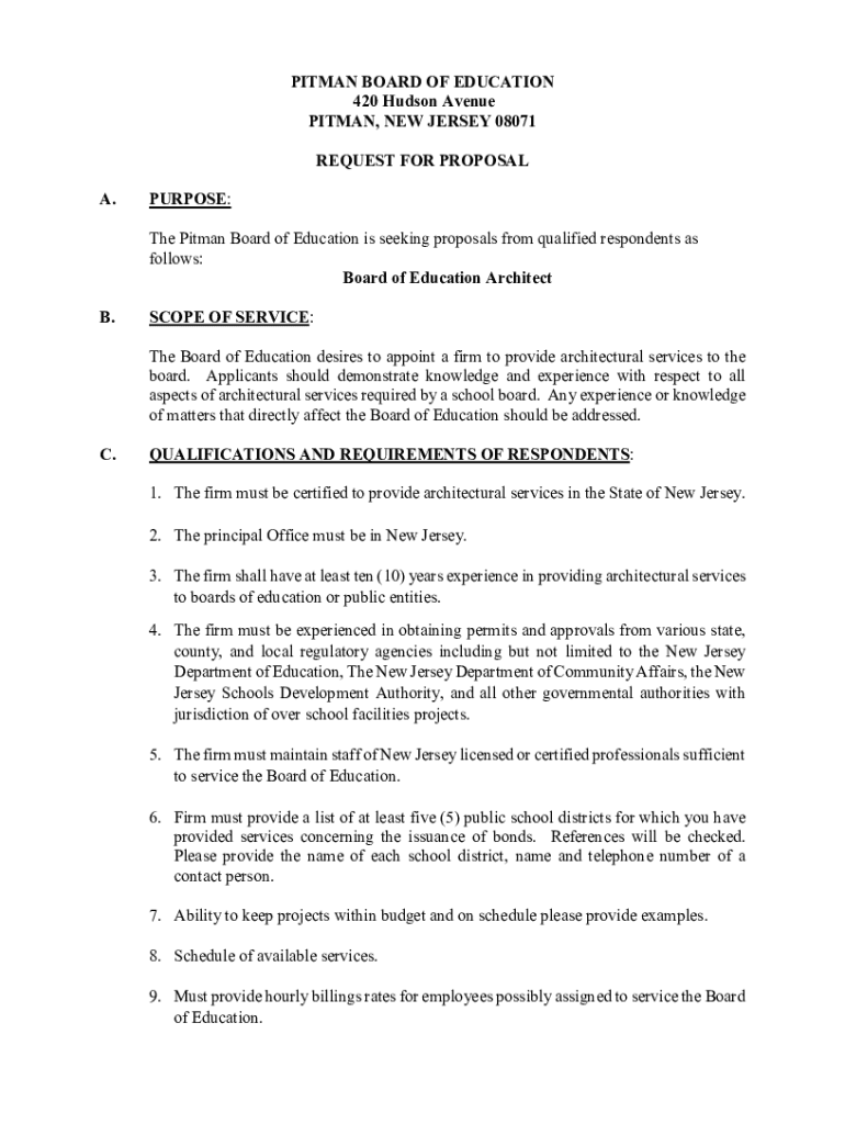 PITMAN BOARD OF EDUCATION 420 Hudson Avenue PITMAN, NEW JERSEY 08071 REQUEST FOR PROPOSAL A.PURPOSE: The Pitman Board of Education is seeking proposals from qualified respondents as follows: Board