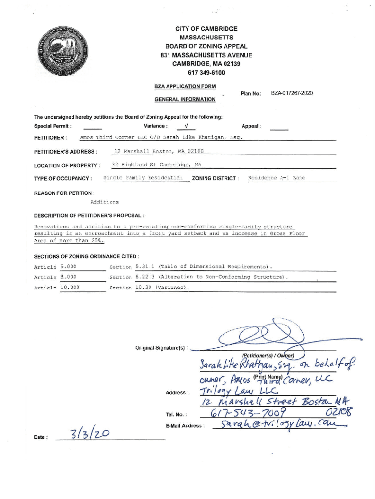 CITY OF CAMBRIDGE MASSACHUSETTS BOARD OF ZONING APPEAL 831 MASSACHUSETTS AVENUE CAMBRIDGE, MA 02139 617 3496100 BZA APPLICATION Formula No:BZA0172672020GENERAL Information undersigned hereby petitions