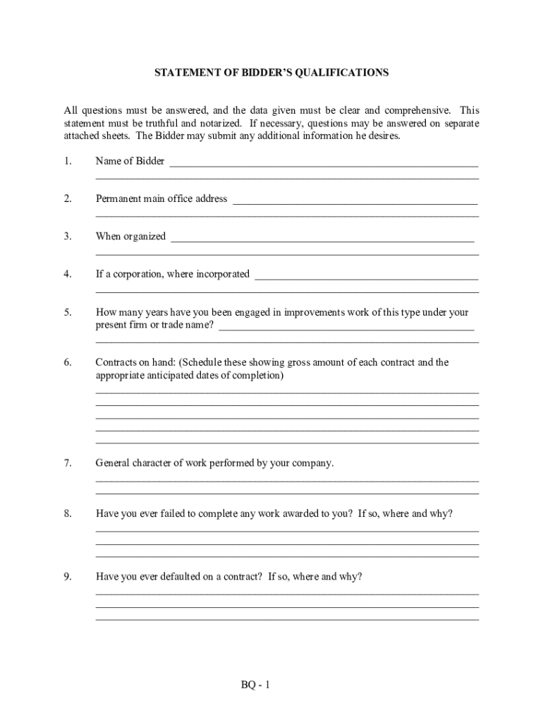 STATEMENT OF BIDDERS QUALIFICATIONS All questions must be answered, and the data given must be clear and comprehensive. This statement must be truthful and notarized. If necessary, questions may be