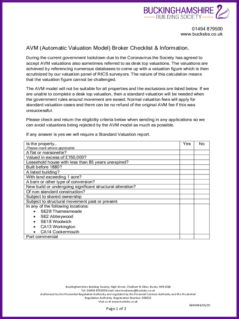 01494 879500 www.bucksbs.co.ukAVM (Automatic Valuation Model) Broker Checklist & Information. During the current government lockdown due to the Coronavirus the Society has agreed to accept AVM valuations
