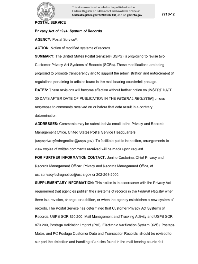 This document is scheduled to be published in the Federal Register on 04/06/2023 and available online at federalregister.gov/d/202307138, and on gov info.gov771012POSTAL SERVICE Privacy Act of 1974;