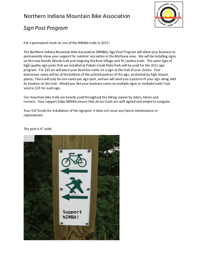 Northern Indiana Mountain Bike Association Sign Post Program Put a permanent mark on one of the NIMBY trails in 2011! The Northern Indiana Mountain Bike Association (NIMBY) Sign Post Program will