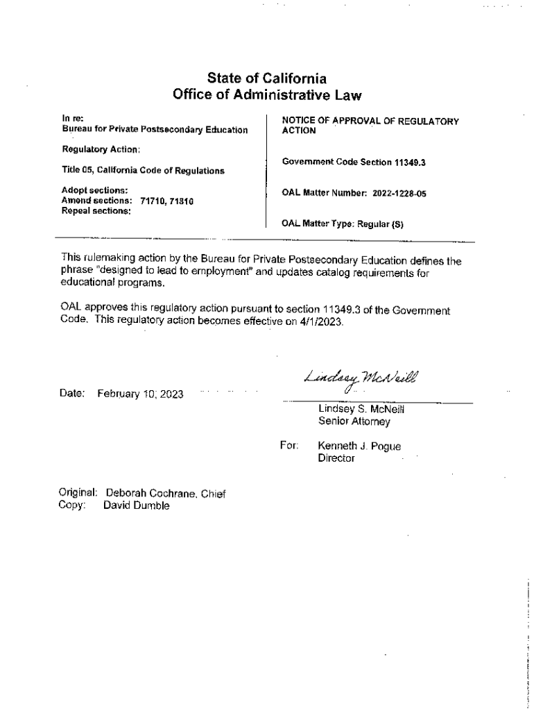 In re:Bureau for Private Postsecondary EducationNOTICE OF APPROVAL OF REGULATORY