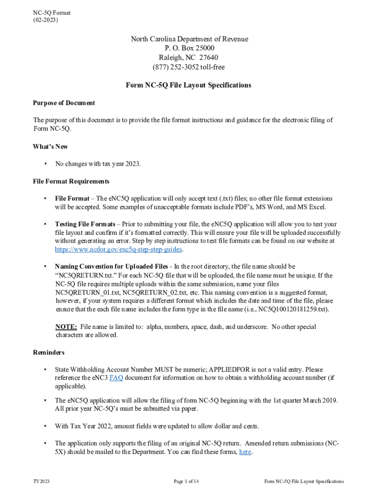 NC5Q Format (022023)North Carolina Department of Revenue P. O. Box 25000 Raleigh, NC 27640 (877) 2523052 toll-free Form NC5Q File Layout Specifications Purpose of Document The purpose of this document