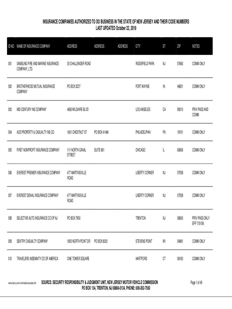INSURANCE COMPANIES AUTHORIZED TO DO BUSINESS IN THE STATE OF NEW JERSEY AND THEIR CODE NUMBERS