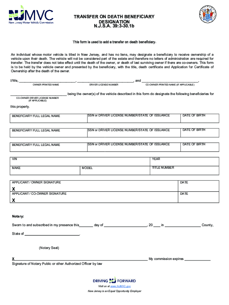 TRANSFER ON DEATH BENEFICIARY DESIGNATION N.J.S.A. 39:330.1b This form is used to add a transfer on death beneficiary. An individual whose motor vehicle is titled in New Jersey, and has no liens,