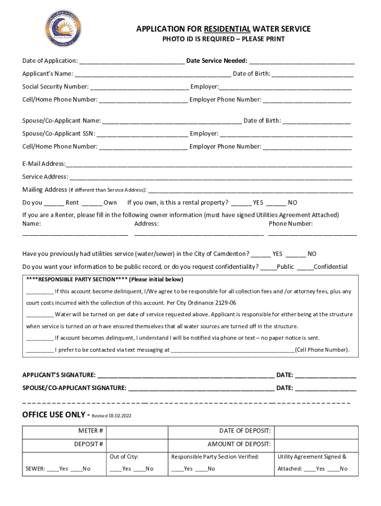 APPLICATION FOR RESIDENTIAL WATER SERVICE PHOTO ID IS REQUIRED PLEASE Private of Application: ___ Date Service Needed: ___ Applicants Name: ___ Date of Birth: ___ Social Security Number: ___ Employer:___