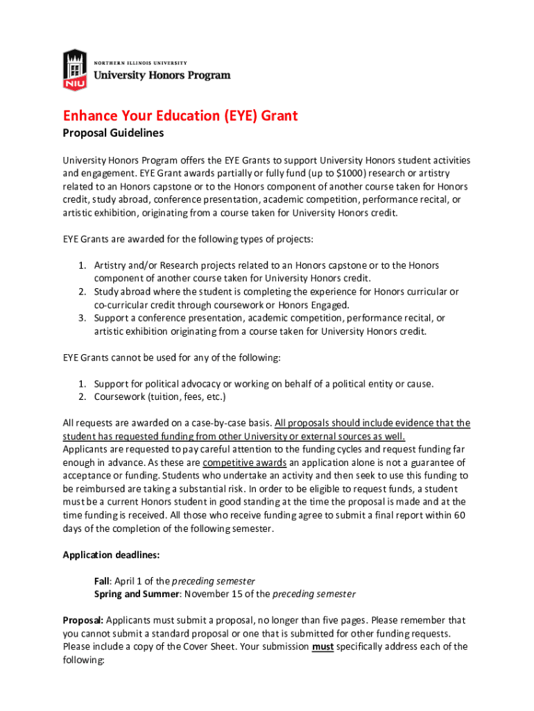 Enhance Your Education (EYE) Grant Proposal Guidelines University Honors Program offers the EYE Grants to support University Honors student activities and engagement. EYE Grant awards partially or