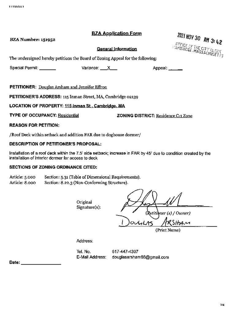 I/I0/4! U4! IBIZA Application Form2021 Nov 3D.: AH 3:42 c. F!CR. . BZA Number: 151952 General Information undersigned hereby petitions the Board of Zoning Appeal for the following: Special Permit: