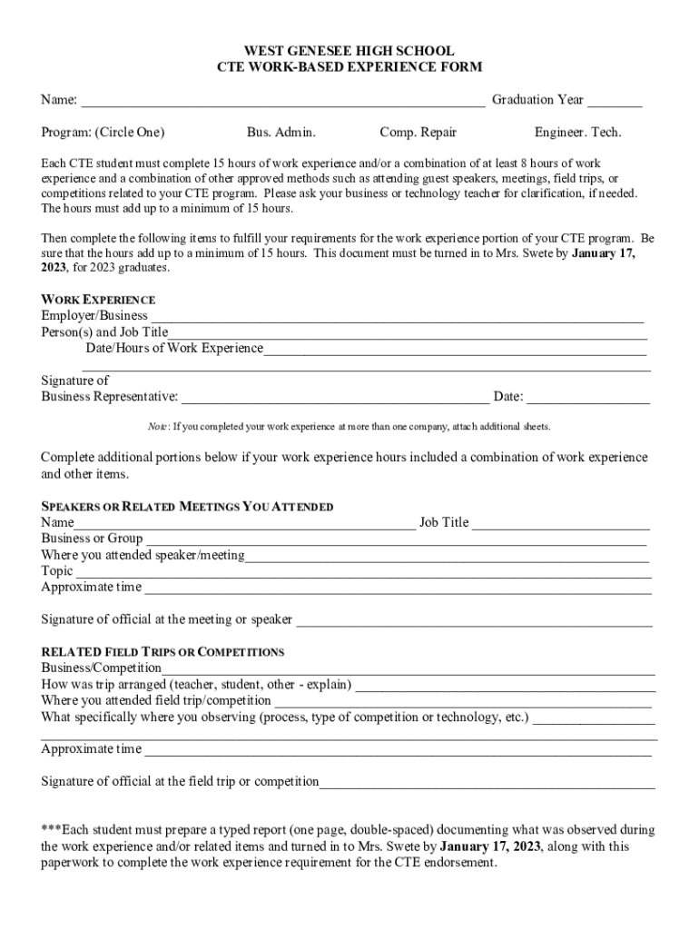 Get the free WORK-BASED EXPERIENCE FORM - West Genesee