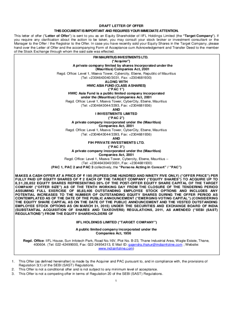 DRAFT LETTER OF OFFER THIS DOCUMENT IS IMPORTANT AND REQUIRES YOUR IMMEDIATE ATTENTION. This letter of offer (Letter of Offer) is sent to you as an Equity Shareholder of IFL Holdings Limited (the
