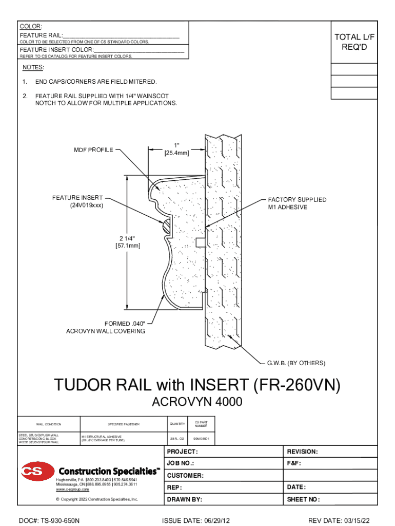 COLOR: FEATURE RAIL:___TOTAL L/F REQ\'COLOR TO BE SELECTED FROM ONE OF CS STANDARD COLORS.FEATURE INSERT COLOR:___ REFER TO CS CATALOG FOR FEATURE INSERT COLORS.NOTES: 1.END CAPS/CORNERS ARE FIELD