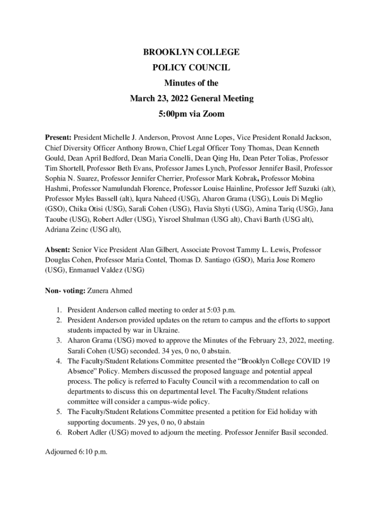 BROOKLYN COLLEGE POLICY COUNCIL Minutes of the March 23, 2022, General Meeting 5:00pm via Zoom Present: President Michelle J. Anderson, Provost Anne Lopes, Vice President Ronald Jackson, Chief Diversity
