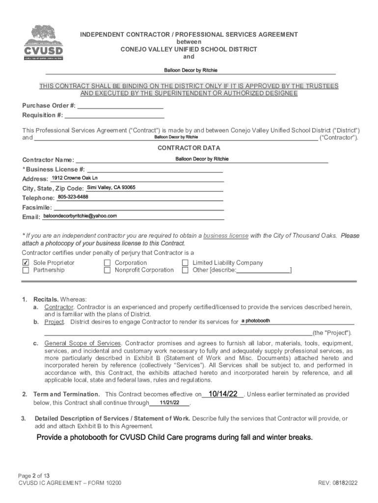 INDEPENDENT CONTRACTOR / PROFESSIONAL SERVICES AGREEMENT between CONE JO VALLEY UNIFIED SCHOOL DISTRICT antis CONTRACT SHALL BE BINDING ON THE DISTRICT ONLY IF IT IS APPROVED BY THE TRUSTEES AND EXECUTED
