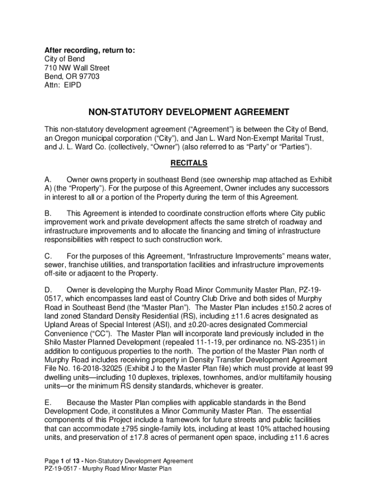 After recording, return to: City of Bend 710 NW Wall Street Bend, OR 97703 Attn: EIPDNONSTATUTORY DEVELOPMENT AGREEMENT This nonstatutory development agreement (Agreement) is between the City of Bend,