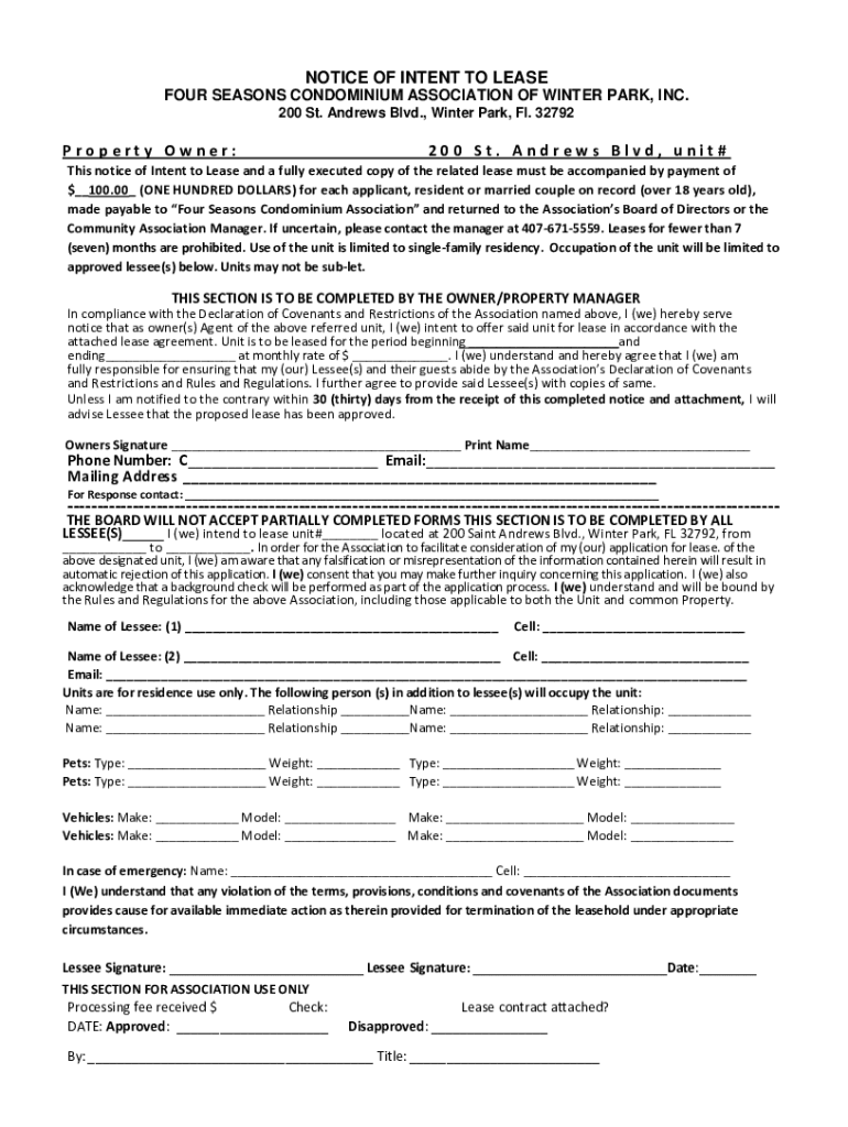 NOTICE OF INTENT TO LEASE FOUR SEASONS CONDOMINIUM ASSOCIATION OF WINTER PARK, INC. 200 St. Andrews Blvd., Winter Park, Fl. 32792Property Owner:200 St. Andrews Blvd, unit#This notice of Intent to