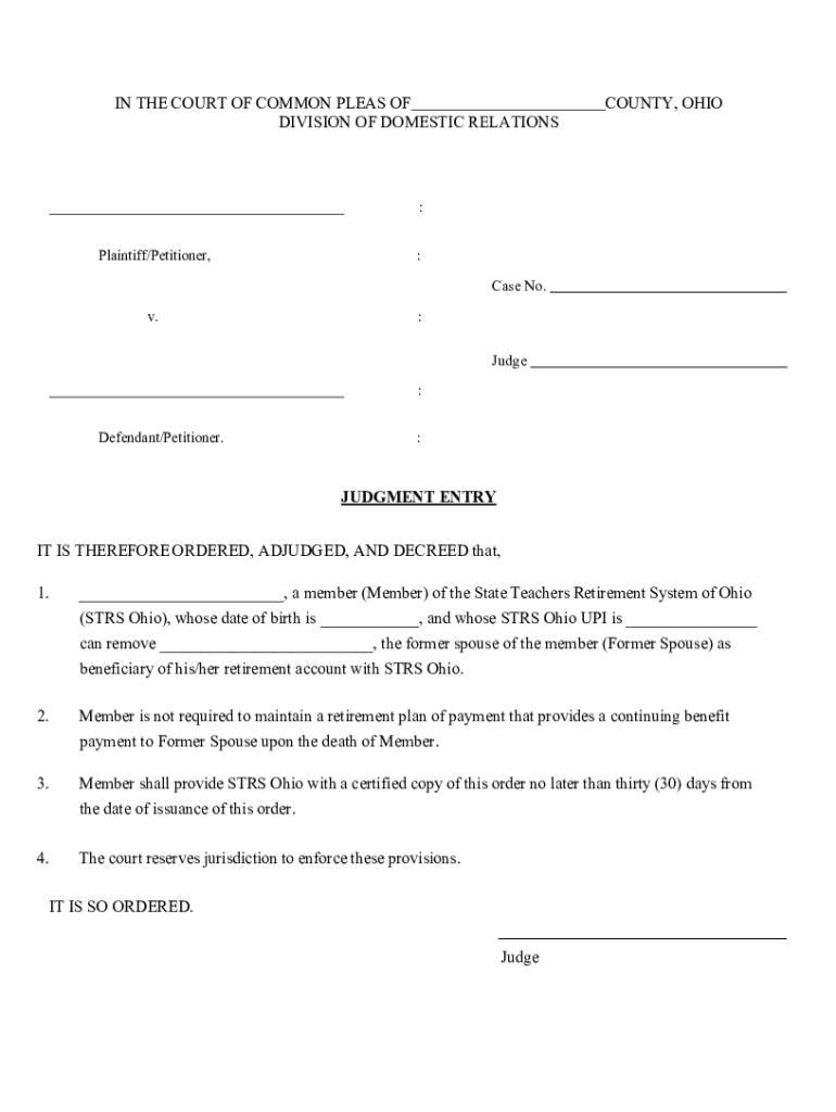 IN THE COURT OF COMMON PLEAS OF DIVISION OF DOMESTIC RELATIONSCOUNTY, OHIO: Plaintiff/Petitioner, : Case No.v.: Judge :Defendant/Petitioner.:JUDGMENT ENTRY IT IS THEREFORE ORDERED, ADJUDGED, AND DECREED