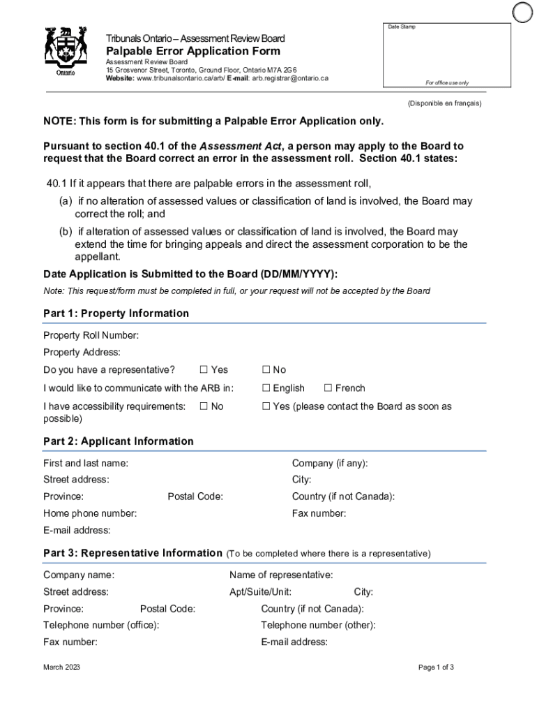Date StampTribunals Ontario Assessment Review BoardPalpable Error Application Form Assessment Review Board 15 Grosvenor Street, Toronto, First Floor, Ontario M7A 2G6 Website: www.tribunalsontario.ca/arb/