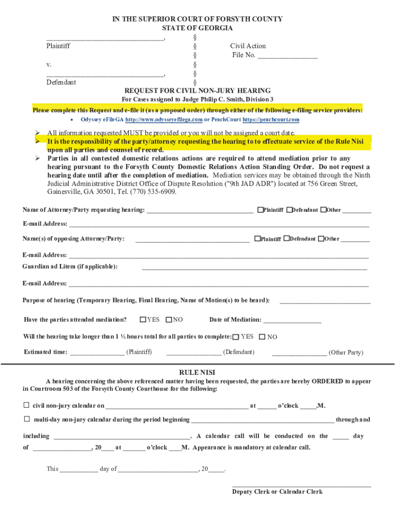 IN THE SUPERIOR COURT OF FORSYTH COUNTY STATE OF GEORGIA ___, Plaintiff Civil Action File No. ___ v. ___, Defendant REQUEST FOR CIVIL INJURY HEARING For Cases assigned to Judge3KLOLS&6PLWK, Division