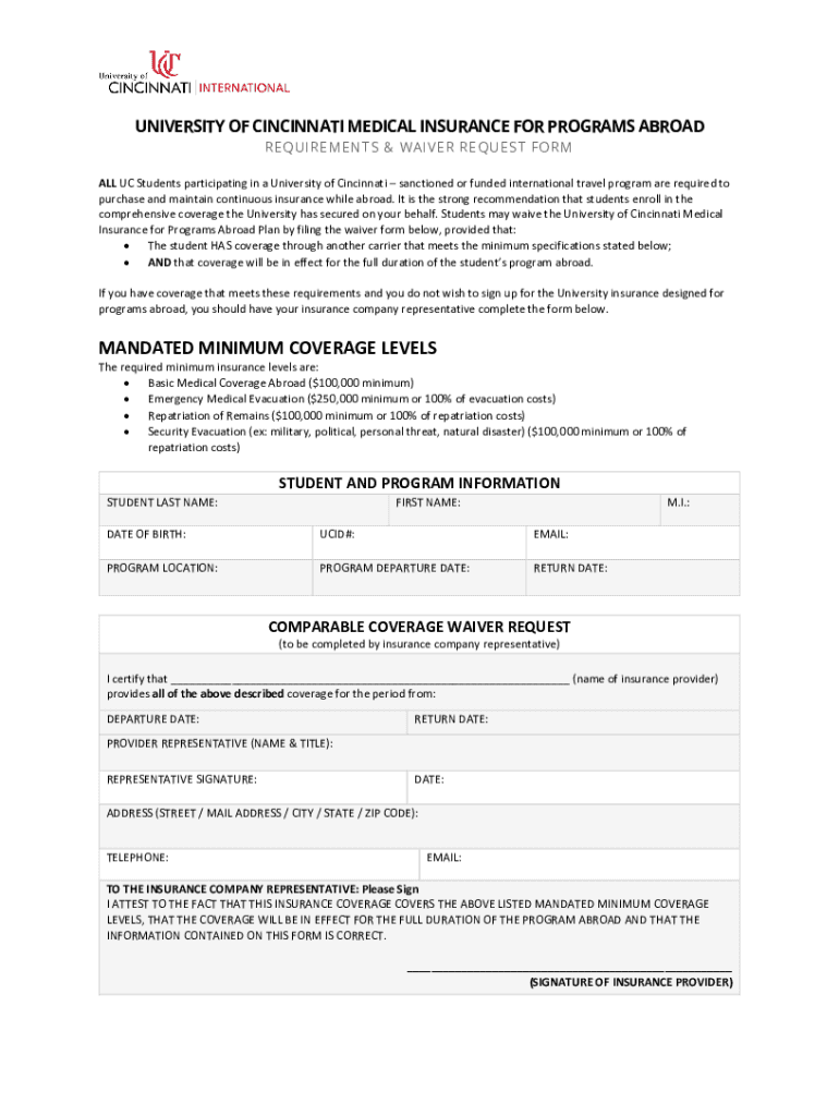 UNIVERSITY OF CINCINNATI MEDICAL INSURANCE FOR PROGRAMS ABROAD REQUIREMENTS & WAIVER REQUEST FORM ALL UC Students participating in a University of Cincinnati sanctioned or funded international travel