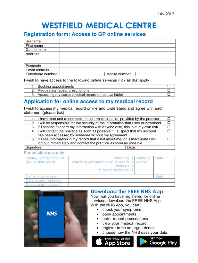 July 2019WESTFIELD MEDICAL Center Registration form: Access to GP online services Surname First name Date of birth AddressPostcode Email address Telephone number Mobile number wish to have access