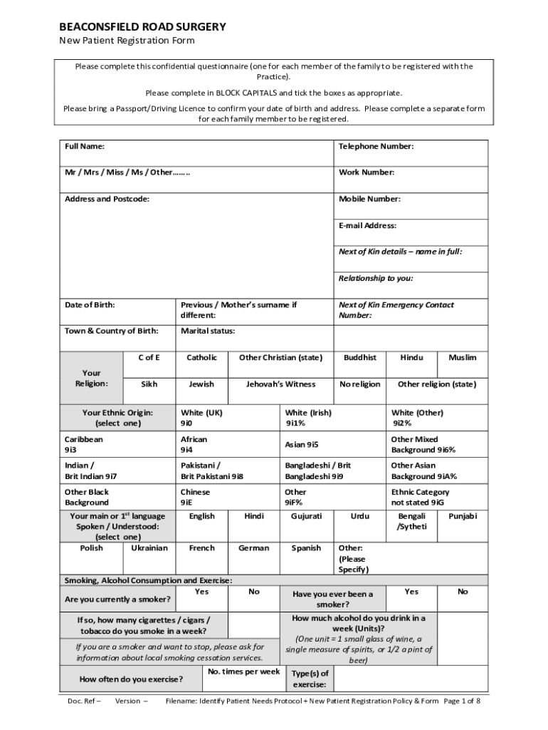 BEACONSFIELD ROAD SURGERY New Patient Registration Form Please complete this confidential questionnaire (one for each member of the family to be registered with the Practice). Please complete in BLOCK