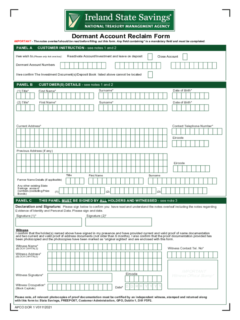 Dormant Account Reclaim FormIMPORTANT The notes overleaf should be read before filling out this form. Any field containing* is a mandatory field and must be completed. PANEL CUSTOMER INSTRUCTION see