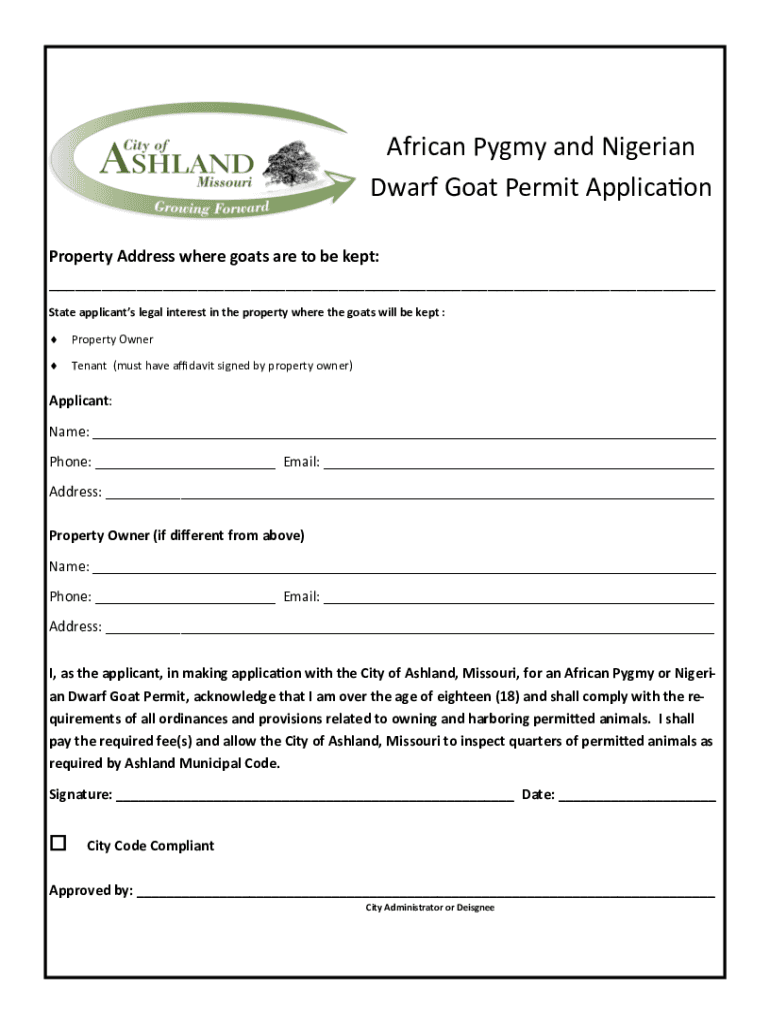 African Pygmy and Nigerian Dwarf Goat Permit Application Property Address where goats are to be kept: ___ State applicants legal interest in the property where the goats will be kept : Property OwnerTenant