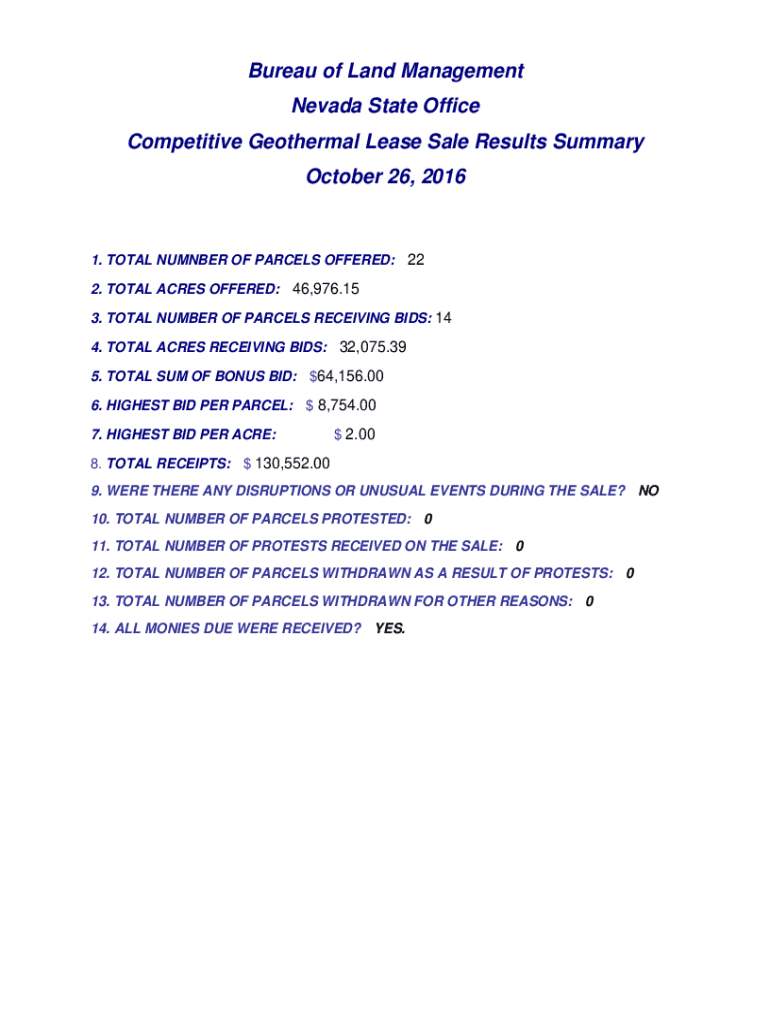 Bureau of Land Management Nevada State Office Competitive Geothermal Lease Sale Results Summary October 26, 20161. TOTAL NUMBER OF PARCELS OFFERED: 22 2. TOTAL ACRES OFFERED: 46,976.15 3. TOTAL NUMBER