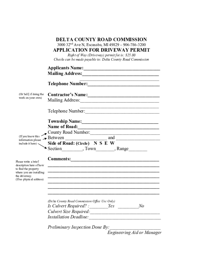 Get the free Delta County Road Commission Application for Driveway Permit
