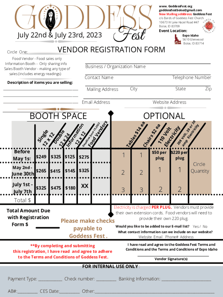 GODDESS Fest July 22nd & July 23rd, 2023Contact NameTelephone Number___Mailing Address ______ Email AddressCityState Website Address$$$325125$$275265$$415145325July 1st $$$325475180 July 7thXX1 23Ch