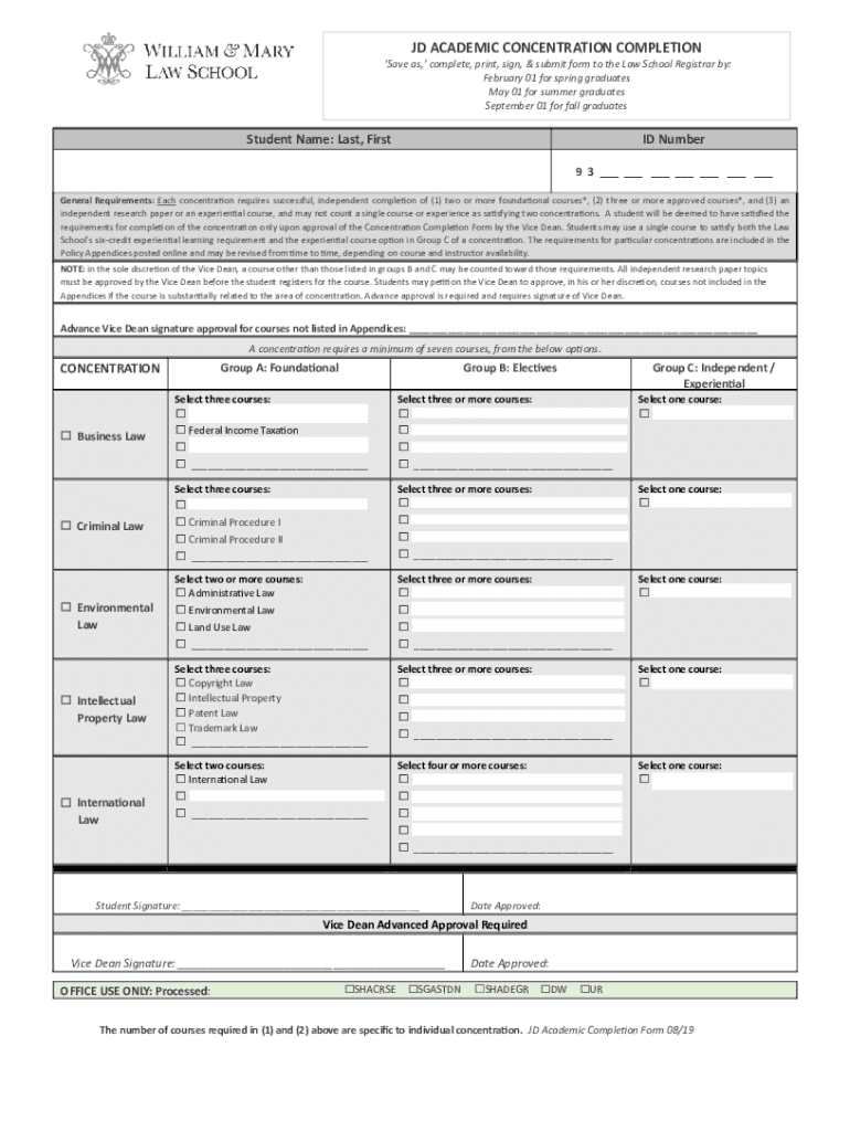 JD ACADEMIC CONCENTRATION COMPLETIONS ave as, complete, print, sign, & submit form to the Law School Registrar by: February 01 for spring graduates from May 01 for summer graduates from September
