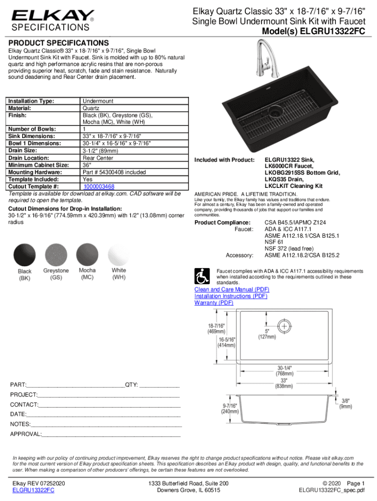 Elway Quartz Classic 33\” x 187/16\” x 97/16\” Single Bowl Under mount Sink Kit with Faucet Model(s) ELGRU13322FCSPECIFICATIONS PRODUCT SPECIFICATIONS Elway Quartz Classic 33\” x 187/16\”