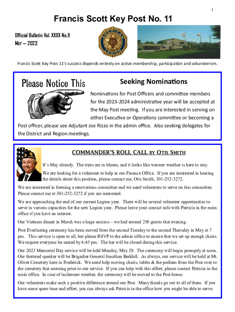 1Francis Scott Key Post No. 11 Official Bulletin Vol. XXX No.11 MAY 2023Francis Scott Key Post 11s success depends entirely on active membership, participation and volunteerism. Seeking Nominations