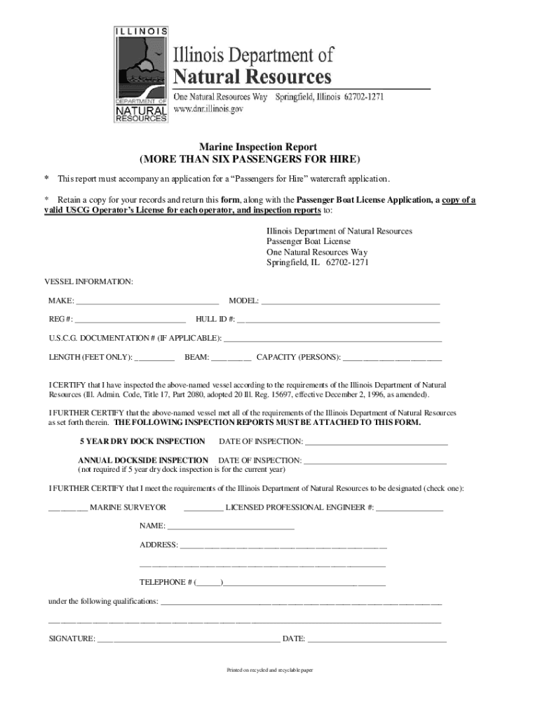 Get the free Marine Inspection Report (MORE THAN SIX PASSENGERS FOR ... - dnr illinois