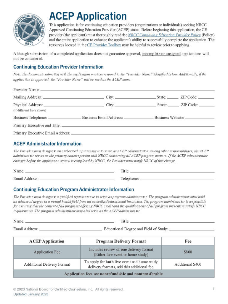 ACE Application This application is for continuing education providers (organizations or individuals) seeking NBC Approved Continuing Education Provider (ACE) status. Before beginning this application,
